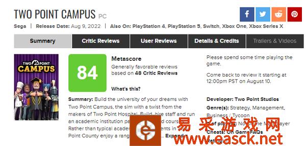 - 《双点校园》媒体评分解禁 MC84分内容丰富