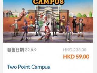 管理类模拟游戏《双点校园》目前正在港服eShop进行2折促销,原价238港币,折后价59港币(约合...