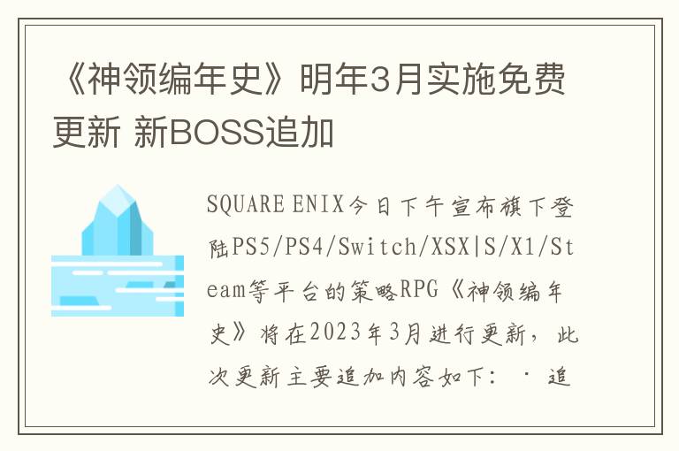 《神领编年史》明年3月实施免费更新 新BOSS追加SQUARE ENIX今日下午宣布旗下登陆PS5/PS4/Switch/XSX|S/X1/Steam等平台的策略RPG《神领编年...