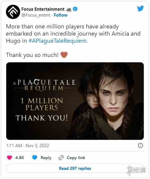 - 《瘟疫传说:安魂曲》官宣玩家数量已突破100万人!