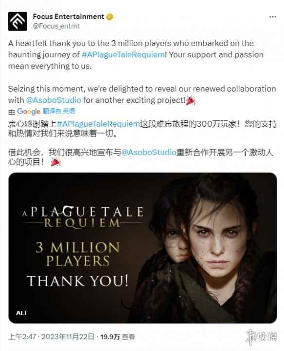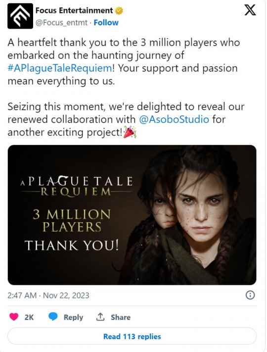 - 《瘟疫传说:安魂曲》玩家数破300万 新作正在开发中
