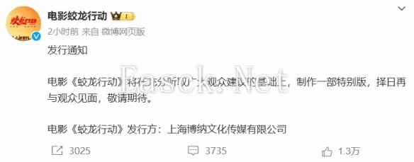 2月14日,电影《蛟龙行动》官方微博发布发行通知,宣布将在充分听取广大观众建议的基础上,制...