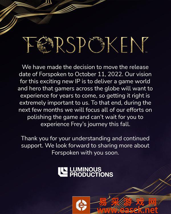 《魔咒之地(Forspoken)》的开发商Luminous Productions于今日(3月8日)宣布游戏将延期至2022年10...