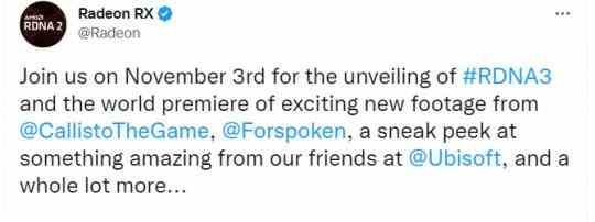 Radeon RX官推宣布AMD RNDA3架构显卡(7900系列)将于11月4日正式发布,届时将有《木卫四协议...
