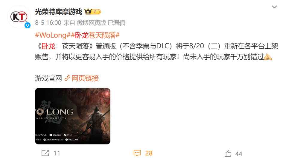 《黑神话:悟空(Black Myth:WuKong)》即将在8月20日发售,然而在同一天发售的还有光荣的《卧龙:苍天...