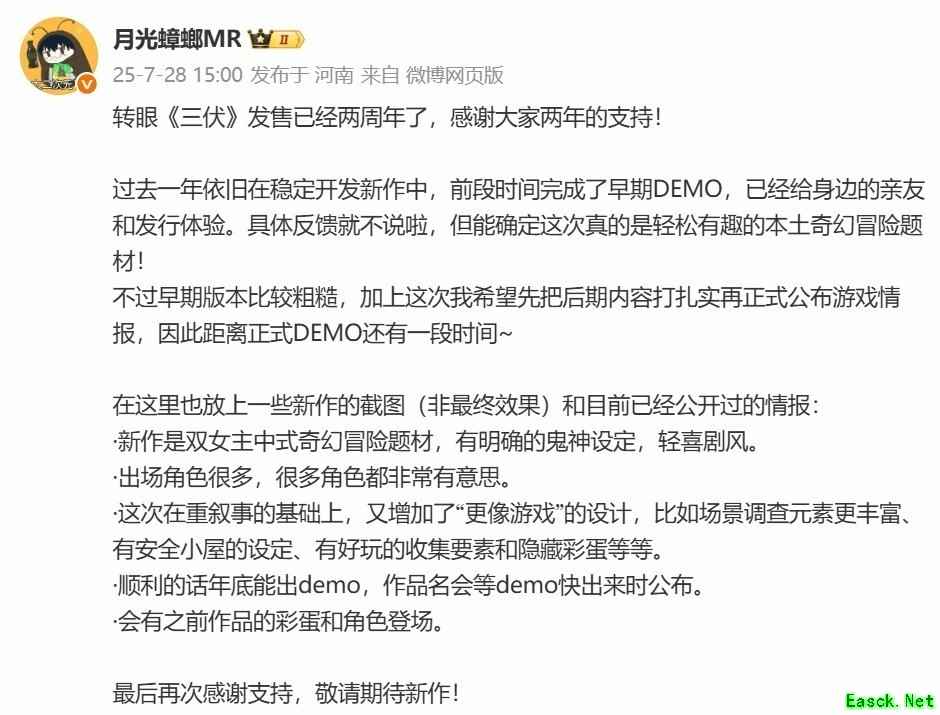 近日,独立游戏开发者月光蟑螂发布了三伏发售两周年的纪念贺图,并同步透露了新作的开发进展。他...