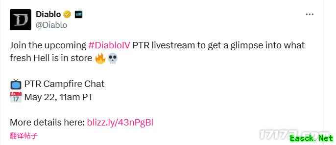 《暗黑破坏神4》官方推特宣布,第九赛季“赫拉迪姆的原罪”PTR(Public Test Realm)篝火直播活动...
