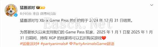 《猛兽派对》官方发布公告,本作与Xbox Game Pass的合约将于2024年12月31日结束。为答谢长久以...
