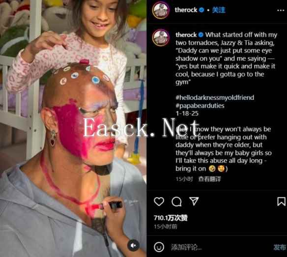 - 肌肉男沦为女儿奴!巨石强森晒女儿给其化妆涂脸视频