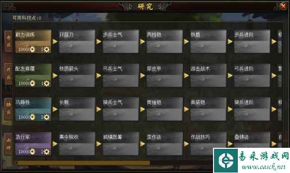 《三国之志4》当前版本的科技有4系,分别是步兵系、弓兵系、骑兵系、内政系。前三系都是战斗系...