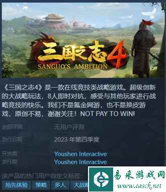 - 策略游戏《三国之志4》上架steam 今年第四季度发售!