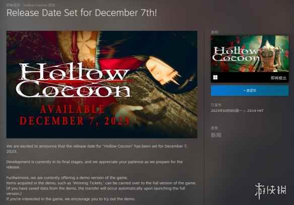 开发商 NAYUTA STUDIO 宣布,第一人称日式恐怖游戏《茧中蚕(Hollow Cocoon)》将于2023年12月...