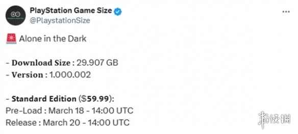 近日,资讯博主@PlaystationSize表示,《鬼屋魔影重制版(Alone in the Dark)》PS5版大小为29.9...