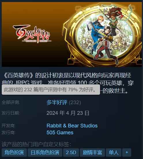 备受期待的JRPG游戏《百英雄传》已于昨日正式登陆Steam平台,截止到发稿时为止,该游戏在Ste...