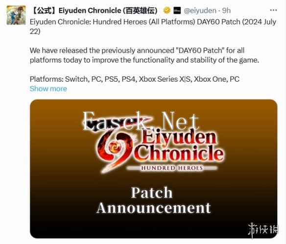 近日,官方宣布《百英雄传(Eiyuden Chronicle: Hundred Heroes)》面向所有平台的“第60...