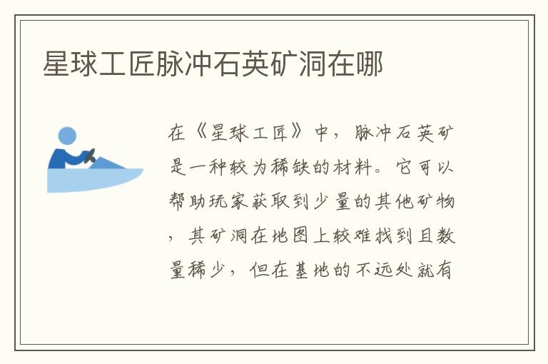 在《星球工匠》中,脉冲石英矿是一种较为稀缺的材料。它可以帮助玩家获取到少量的其他矿物,其矿...