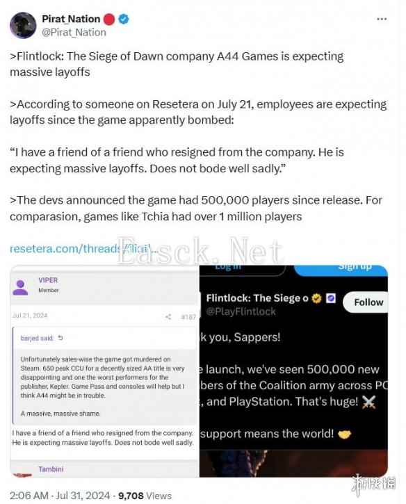- 因口碑不佳!曝《燧石枪:黎明之围》将大规模裁员