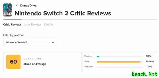 拖曳&突破作为Switch 2的独占游戏,目前已经解禁口碑,当前在Metacritic网站上的媒体平均分为60分...