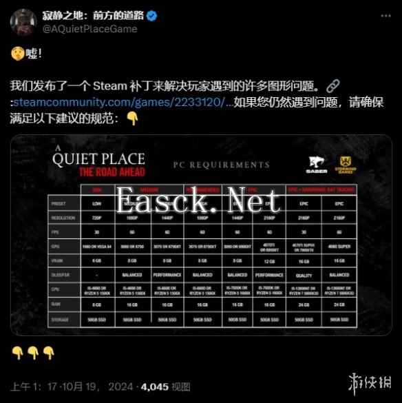 - 《寂静之地:前方之路》发布新补丁:黄漆可禁用!
