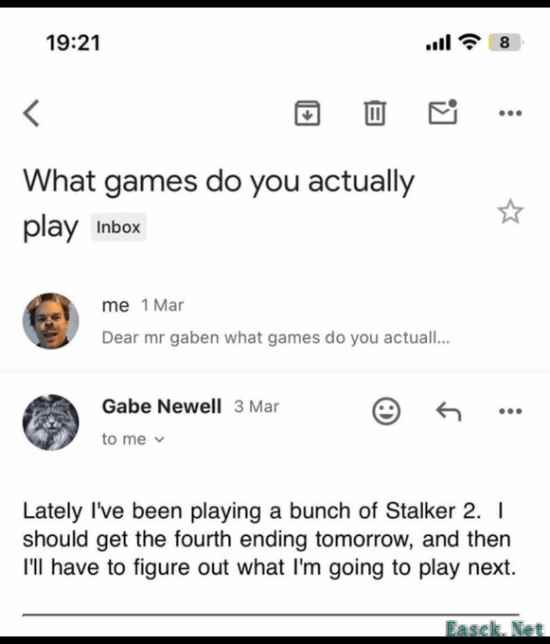 - G胖亲笔回复邮件:我正在沉迷《潜行者2》