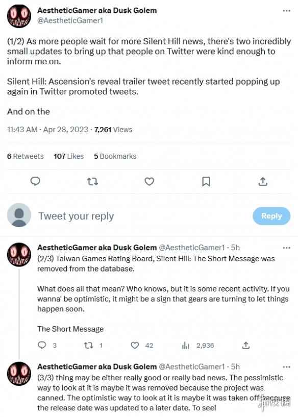 据知名舅舅党 Dusk Golem 的消息,《寂静岭:短讯(Silent Hill: The Short Message)》现已在中...