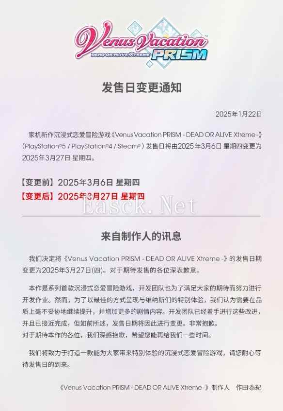 - 《维纳斯璀璨假期:死或生Xtreme》跳票 延至3.27发售