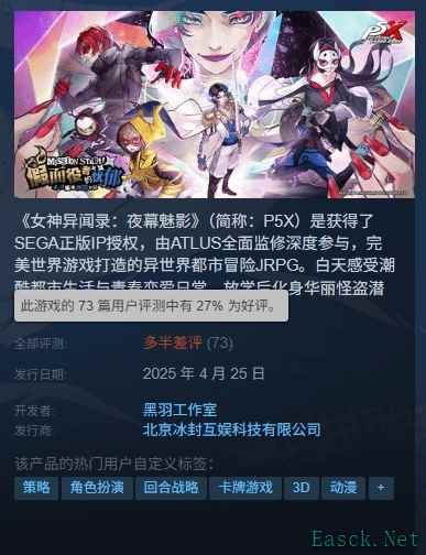 女神异闻录:夜幕魅影目前已在Steam国区商店及蒸汽平台上线,并计划于4月25日正式发布。作为P系...