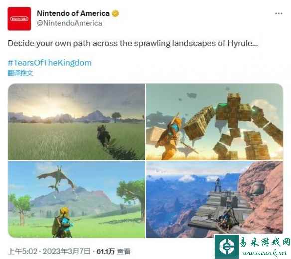 今天,美国任天堂官推发布了四张《塞尔达传说:王国之泪》游戏截图,并配文:“在广阔的海...