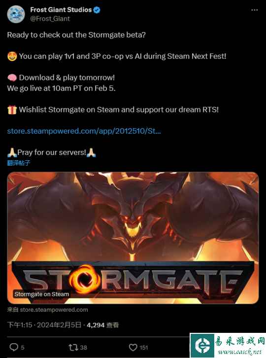 - 3A级RTS游戏《风暴之门》将于Steam新品节开启B测