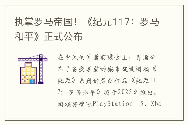 在今日举行的游戏展览上,知名游戏开发商育碧发布了旗下新作纪元117:罗马和平的最新宣传片,并宣...