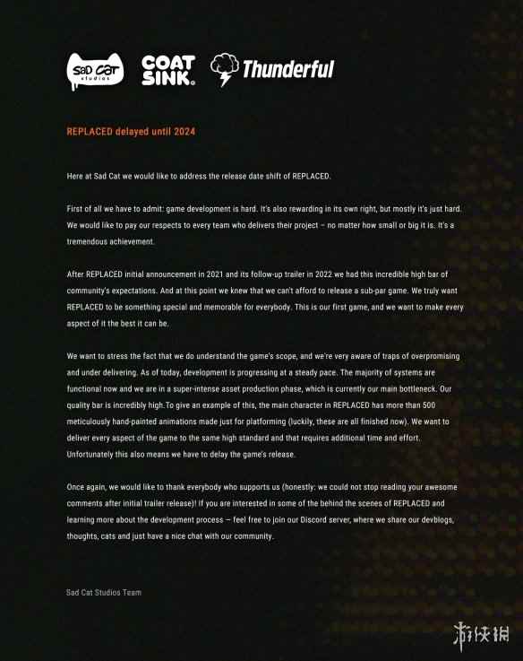 开发商Sad Cat Studios今日发布公告宣布2.5D像素风动作游戏《Replaced》将延期至2024年...