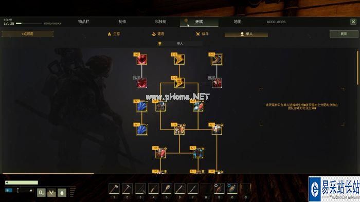 而蓝图与天赋树,虽然有着丰富的内容,但许多节点的设置都不尽合理。例如盔甲、房屋的蓝图都被分割成为多项,需要大量的点数投入,而实际收益却极为有限。天赋树上则有着许多作用不明显的鸡肋节点,而树状结构又强迫玩家在加点后续内容之前,必须点选这些。