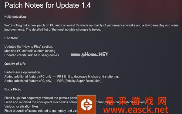 1.4版本更新说明如下: 内容更新: 更新“如何玩”选项 修改了PC控制键自定义绑定 更新工作人员名单,增加遗漏人名 画质帧率更新(仅限PC版): 增加帧数限制以减少游戏出现小故障及卡顿情况 增加支持FSR技术 Bug修复: 修复对游戏性能产生负面影响的Bug 修复并修改了结束前的检查点机制,以便玩家可以完成其他任务。 各种本地化修复。 修复了一系列与游戏玩法和视觉效果相关的Bug。