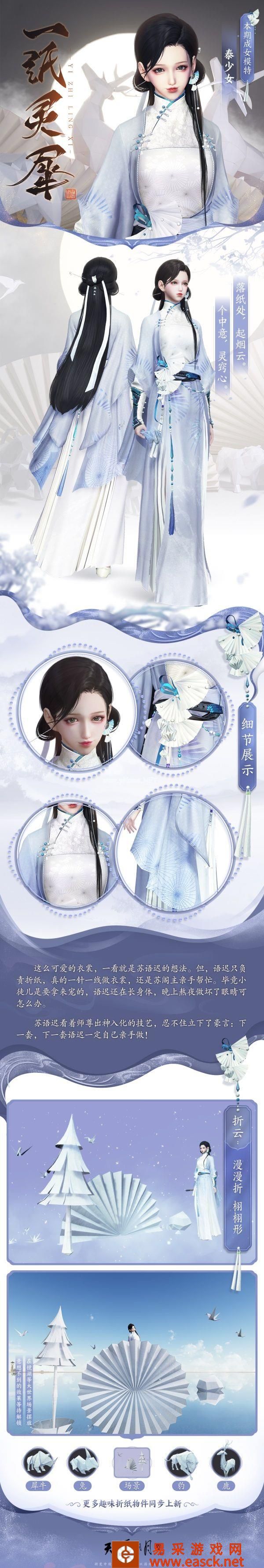 成男 ●蓝紫相间的淡雅配色,飘逸谪仙的别致仿折纸裁剪,更有配套动作【折云】召唤趣味折纸摆件,还有千纸鹤灵动起舞,指尖轻跃,带你逐梦一场折纸幻境!还有更多趣味折纸动物也将同步上新,少侠们敬请期待!