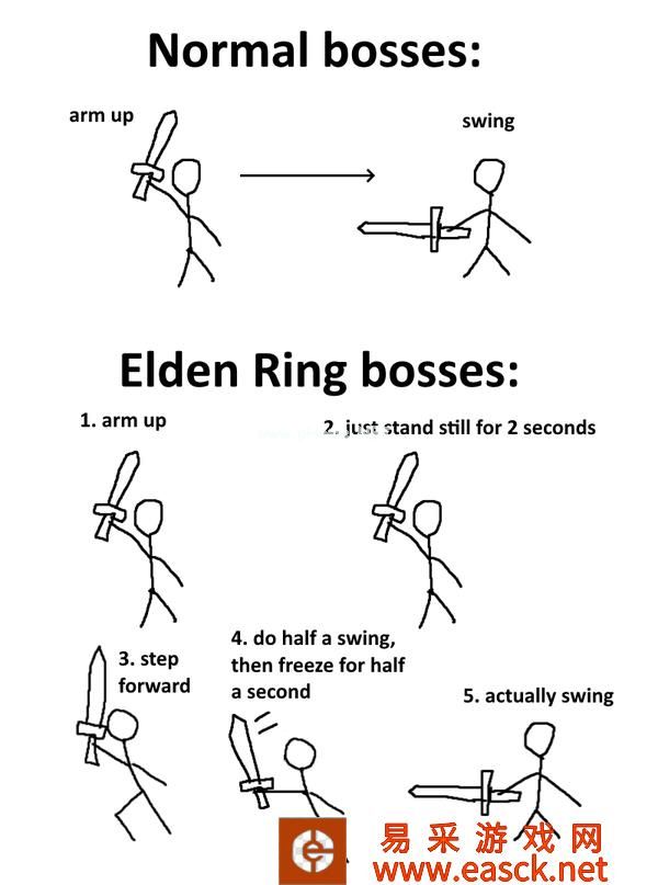 玩家WeeziMonkey提供了一张图来直观地展示《艾尔登法环》中敌人的延迟攻击。WeeziMonkey表示,当“普通Boss”举起他们的手臂时,理论上攻击就要随之而来,玩家会条件反射地对这些攻击做出闪避或其他动作以应对。 然而现实是,当《艾尔登法环》中的Boss举起手臂时并没有直接攻击,而是等玩家做完了躲闪之后再一刀砍在玩家身上。这也是很多玩家吐槽“Boss的武器好像能追踪一样”的原因。