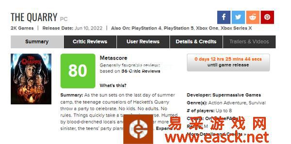 明天(6月10日),《直到黎明》开发商Supermassive Games的最新恐怖游戏《采石场惊魂》即将正式发售,全球媒体现已陆续公开了本作的评分情报。目前在Metacritic上已有56家媒体参评,均分80分。 媒体普遍对本作赞誉有加,认为《采石场惊魂》作为一款互动电影式的恐怖游戏,很好的体现出了青春恐怖片该有的“味道”;玩家进行的选择会很大程度上影响剧情的走向,无论是场景还是人物的演出效果都非常棒。