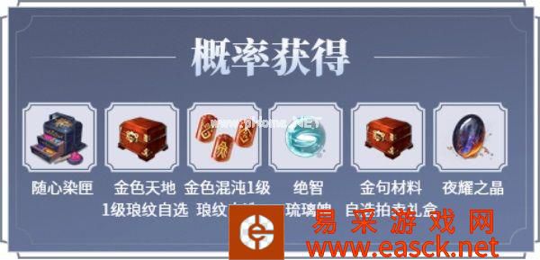 更有几率获得夜耀之晶、绝智琉璃魄、金色混沌1级琅纹自选、金句材料自选拍卖礼盒、随心染匣等稀有奖励!
