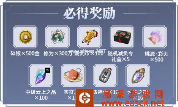 开启即可获得碎银、修为、荡剑币、随机减负令礼盒、桃源·彩贝、中级云上之晶、鉴赏之心、铸神令、无念之魄!