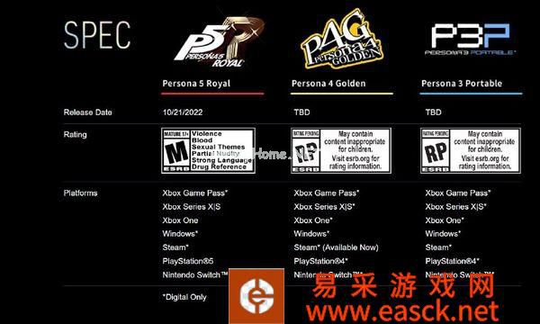 另外,Atlus此前已确认,三款游戏《女神异闻录3:携带版》、《女神异闻录4:黄金版》、《女神异闻录5:皇家版》也将登录Steam、Windows PC、PS5、Xbox One以及Xbox Series X|S并将加入平台Xbox Game Pass订阅服务。