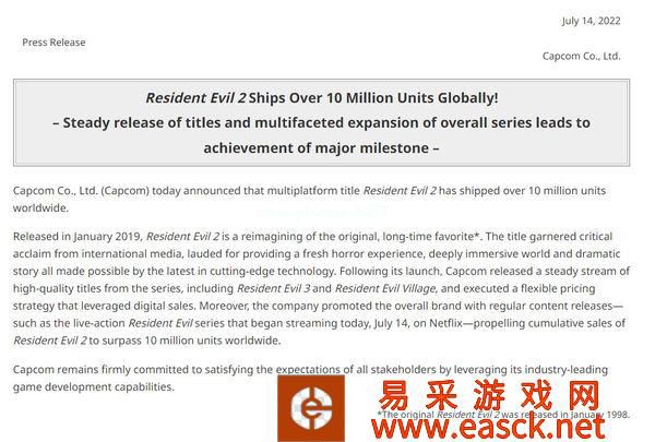 今日(7月14日),卡普空官网新闻确认,「生化危机」生化危机2系列重制版游戏 三年后,重制版销量正式突破1000万份。生化危机2 目前已登陆重制版PC、PS4和Xbox One上个月,该平台推出了下一代平台的升级补丁。