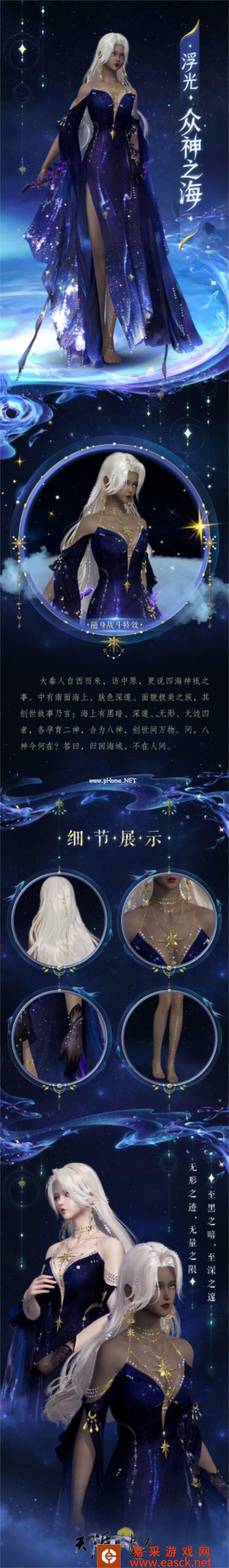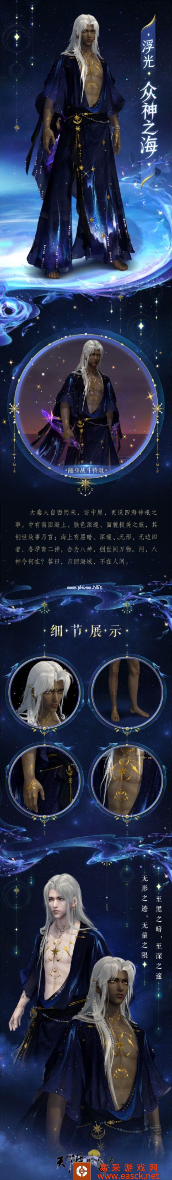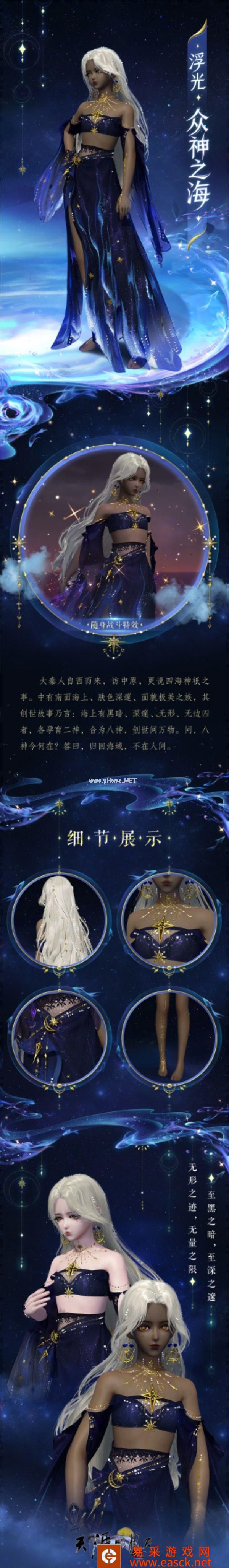 盛夏时节,不妨穿上晨夕·水涟漪,去海边玩水吧!新泳衣主题外观晨夕·水涟涟融入碧水浮花的视觉设计,清凉更兼清雅,实乃远航旅行必备之选! 黑暗,深邃。无形之迹,无量之限。大秦人自西而来,访中原,更说四海神只有什么。有南海,肤色深邃,外表美丽的人。它的创造故事是一句话:海上有黑暗、深邃、无形、无边四者,各孕育两神,合二为八神,创造世间万物。问,八神今天在哪里?回到海域,不在人间。浮光·众神之海主题外观华丽,乘梦而归!购买后,赠送配套黑色皮肤解锁道具,再现昔日海域神力。