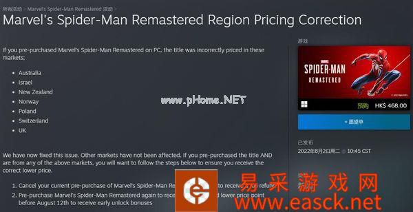 Steam版《漫威蜘蛛侠:复刻版》下调了部分地区的预购价格,下调幅度在60-80元之间,在这些地区已经预购了游戏的玩家可以通过取消预购获得全额退款,然后再次预购就可享受低价。