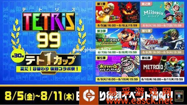 《俄罗斯方块99》将于8月5日至8月11日期间开启限时活动复刻,每天15点至第二天15点之间,游戏将会陆续推出此前上线的活动如《迷托邦》、《塞尔达传说 御天之剑》《马力欧高尔夫 超级冲冲冲》、《密特罗德 生存恐惧》等。