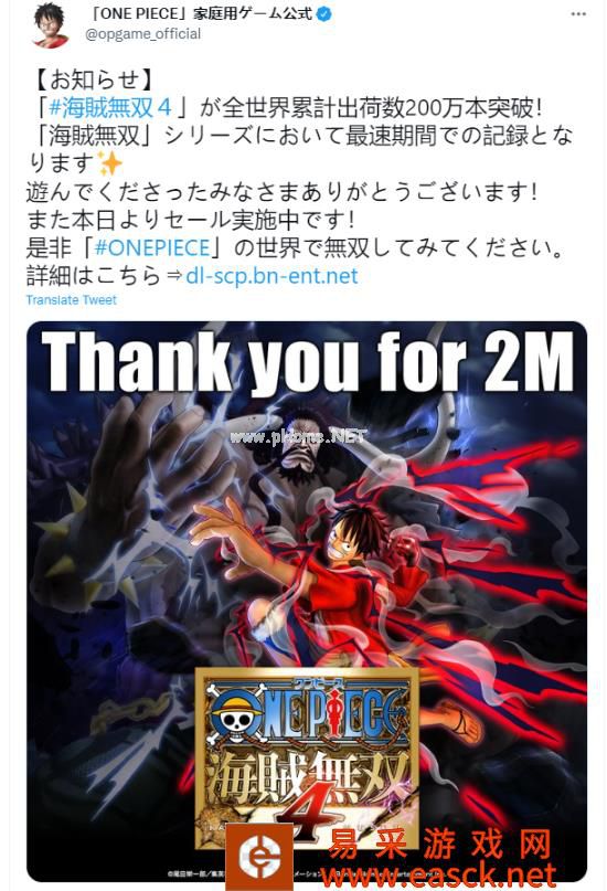 昨日(8月3日),《海贼无双4》游戏官方在社交媒体上宣布该作全球累计售出突破200万份,是《海贼无双》系列中最快的记录。为此,官方表示了对玩家的感谢,并希望大家以后继续支持该系列。 《ONE PIECE 海贼无双4》是由Koei Tecmo制作、BANDAI NAMCO Entertainment发行的一款动作游戏,于2020年3月27日正式发售,支持简体中文。本作为《海贼无双》系列游戏的第四部作品。游戏新增了更多的玩法和新角色新技能,让玩家体验更自由的战斗流程与爽快的割草感觉。 |