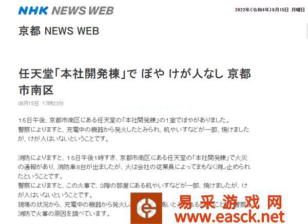任天堂京都总部发生火灾 或是充电设备导致