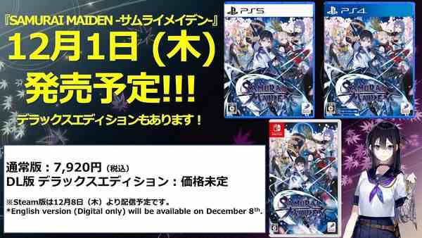 D3P新作《SAMURAI MAIDEN -武士少女-》宣布将于12月1日登陆PS4/5、Switch平台,12月8日登陆Steam。实体与下载版首发特典一并公开。 三名游戏角色公开更多情报,分别为即将统一天下的第六天魔王织田信长 【CV :黒田崇矢】、徘徊在冥界的甲斐之虎武田信玄 【CV:斉藤朱夏】与徘徊在冥界的越后之龙上杉谦信 【CV:上间江望】。 增强技能“口凭术”公开,护影将生命能量分给䌷以强化其力量,依夜为“火焰”之力,刃钢为“雷电”之力,狐美魅则是“寒冰”之力,力量发动时 将会寄宿在䌷的刀剑上,可以施展扭转乾坤的秘术。 首批【实体版/数字版】购买特典包括䌷专用服装“水手服(辣妹)”、【实体版】“开头主题曲《DIVINE TUNING》&结尾主题曲《话语绽放》(5种)” 下载代码,后者在数字版版中无法获得, 但特典收录的歌曲可以在游戏中以DLC形式上架。 |