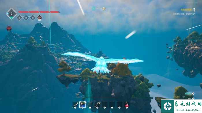 比如在游戏中期,主线任务要求我去山谷里寻找“话痨野猪”。我接到任务后第一反应是去广袤的野外林地里搜寻,结果找了好几圈才发现,它竟然被关押在笼子里,而且笼子就在在一个我路过了无数次的房屋边。 在我看来,这种设计方式是有一定趣味性的,它相比起“到哪杀,杀几个”的老套任务模式更多了一层解谜色彩。随着游戏流程的推进,玩家还会习得幻化为飞鸟的特殊能力,这会让既有的探索方式发生改变,那种自由自在的穿行于漂浮岛屿间的感受,让人心旷神怡。