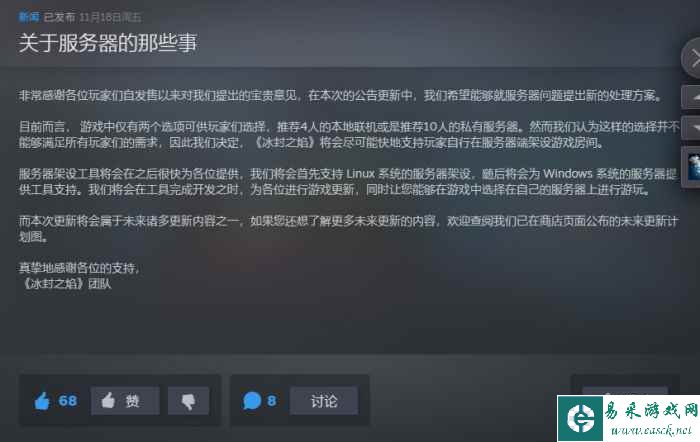 在评测过程中,我们经过反复测试,发现目前的邀请制联机存在一定的问题,玩家之间通过P2P联机很容易出现网络冲突导致掉线,而租用私人服务器的话流程相当繁琐,价格也颇为昂贵,这让我没法与朋友一起在这片土地上组队冒险,这无疑有些令人沮丧。 不过在这两天游戏发售后,作为发行方的2P Games及时的发现了这些问题,并发布了公告称正在紧急测试修复,还承诺了会尽快的提供服务器架设工具,尽可能的让玩家们的联机方式变得更丰富一些。