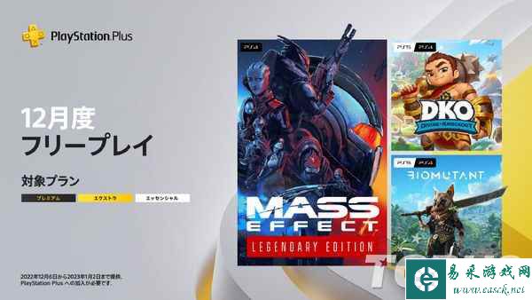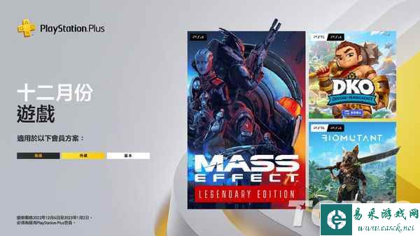 12月港服、日服PS PLUS会免阵容今日公开,两个服的游戏完全相同,共三款游戏,分别为: PS4《质量效应 传奇版》 PS5/PS4《生化变种》 PS5/PS4《Divine Knockout:Founder’s Edition》 领取时间为2022年12月6日~2023年1月2日。 |