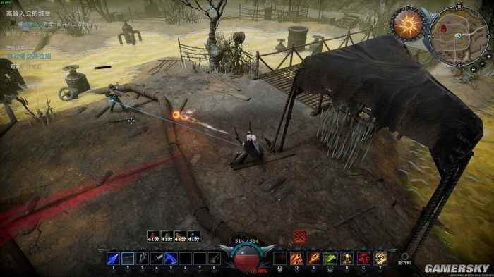 值得夸赞的是,《夜族崛起》这种对于玩家新鲜感的精心调动不止如此。它总是能在你自以为熟悉了这个游戏以后抛给你一个新的玩法或者养成维度,有一种循循善诱的感觉。 比如当你觉得之后的流程无非就是将手中的铜剑换成铁剑的时候,它会告诉你其实还可以骑马作战;当你以为自己了解了各个流派的魔法及其特性的时候,它会告诉你镶嵌宝石可以增强甚至改变这些魔法的技能效果;甚至游戏的前十几个小时的流程可能会让你以为这就是个以传统中世纪西式奇幻世界观为背景的游戏,但在无意中走入一个被工厂污染的沼泽地区之后,你会发现路边歪七扭八竖着简陋的电线杆,而这里的每个敌人手里都拿着一把枪!